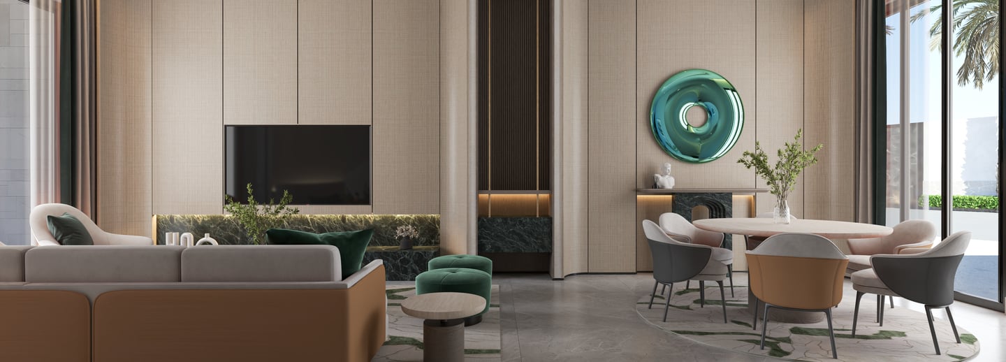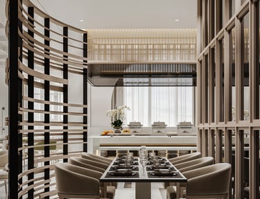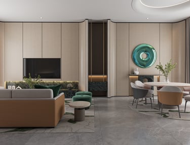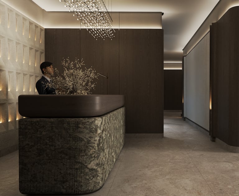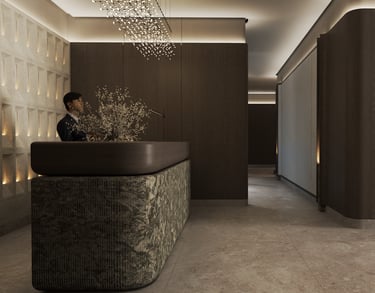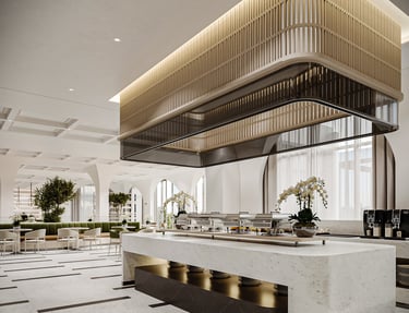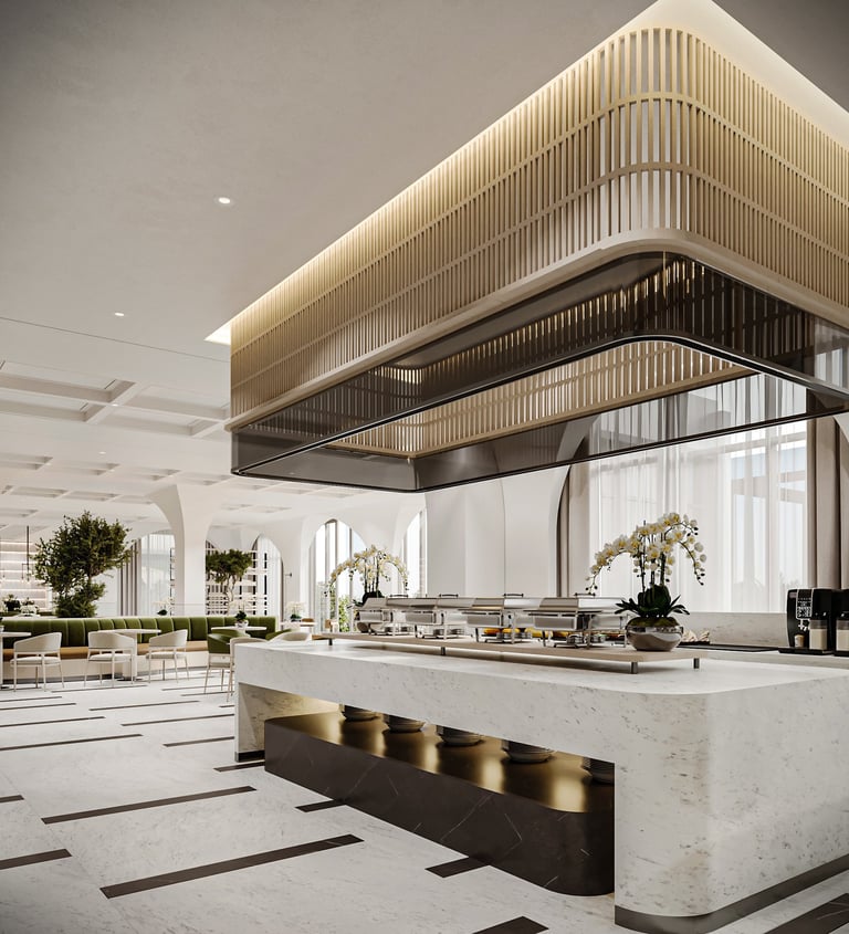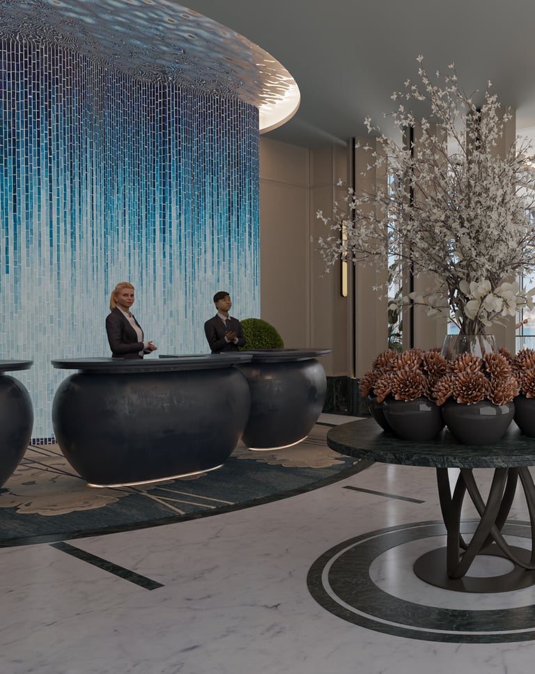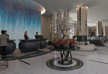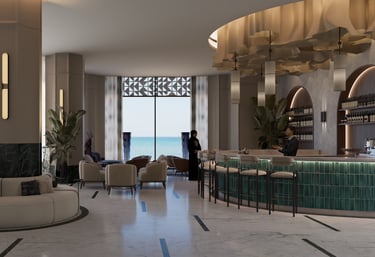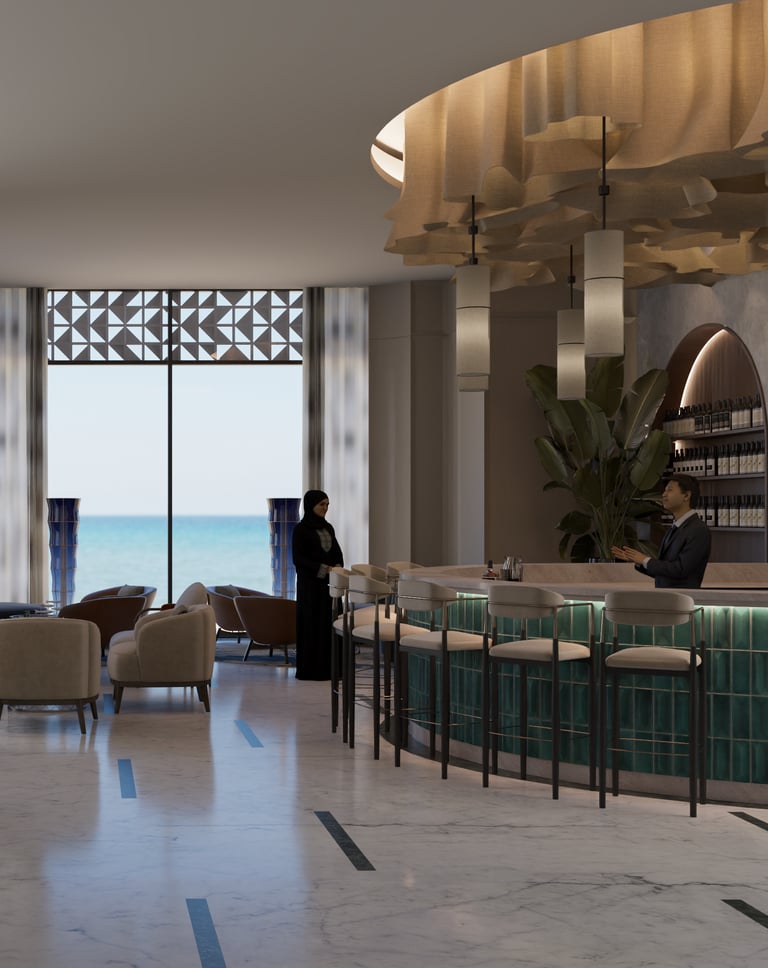 The reception design of this beachfront resort in Saudi Arabia combines luxury and modernity with distinctive aesthetic and functional details. Inspired by the resort's location by the sea, the design incorporates a blue gradient mosaic backdrop that reflects the movement and calmness of the water, adding a unique marine touch. The space features marble floors, warm lighting, and natural plants, creating a vibrant and serene atmosphere that embodies the resort's identity. High-quality materials like natural stone and wood are used to achieve a balance between comfort and simplicity. Additionally, the layout ensures smooth circulation and provides a welcoming and relaxing experience for guests.