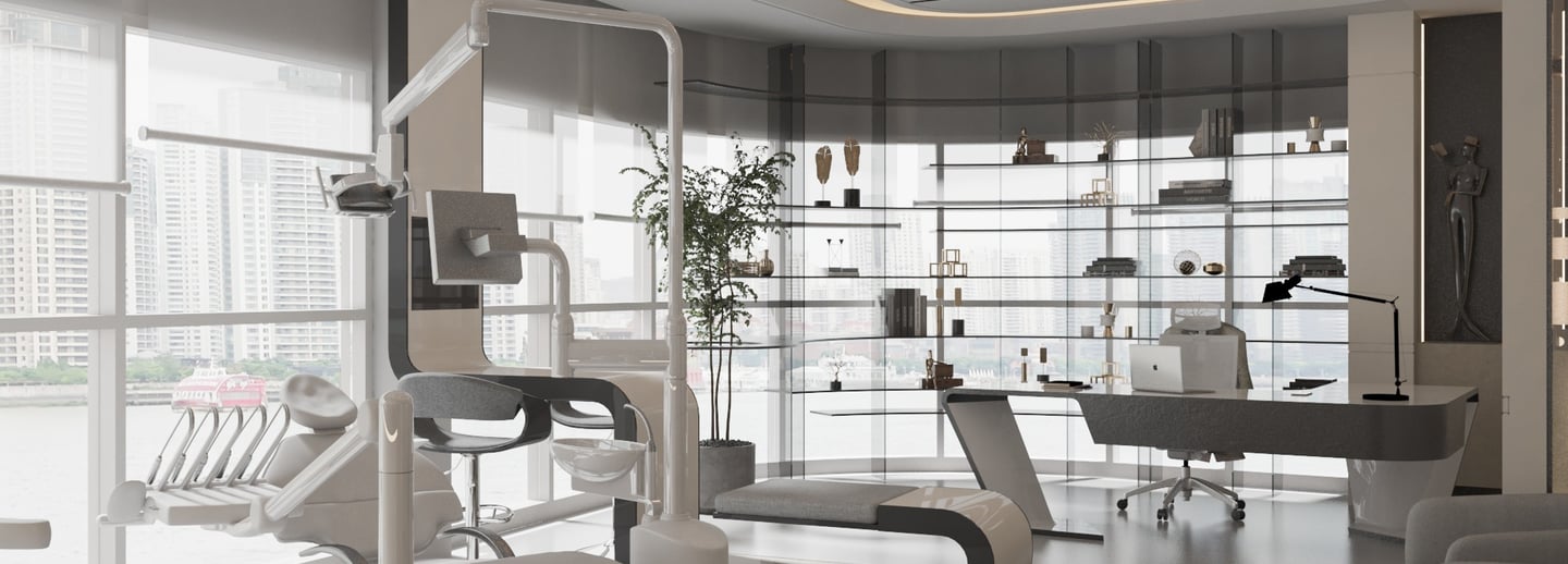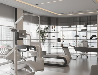 The design of Al-Shami Dental Clinics is modern and innovative, with a focus on using curved lines that reflect a contemporary and unique character. The walls are adorned with smooth, curved designs that create a balance between aesthetics and visual comfort, enhancing a sense of calm for visitors. Warm and soft colors, such as white, light gray, and pale blue, have been chosen to provide a comfortable and safe environment for patients. Smooth, curved surfaces are integrated into the furniture and facilities, complementing the dynamic design concept, with curved chairs and tables selected to ensure comfort in an elegant atmosphere.