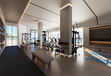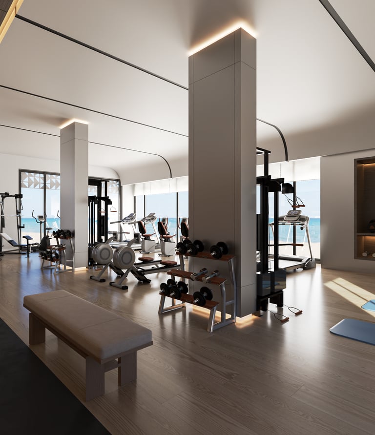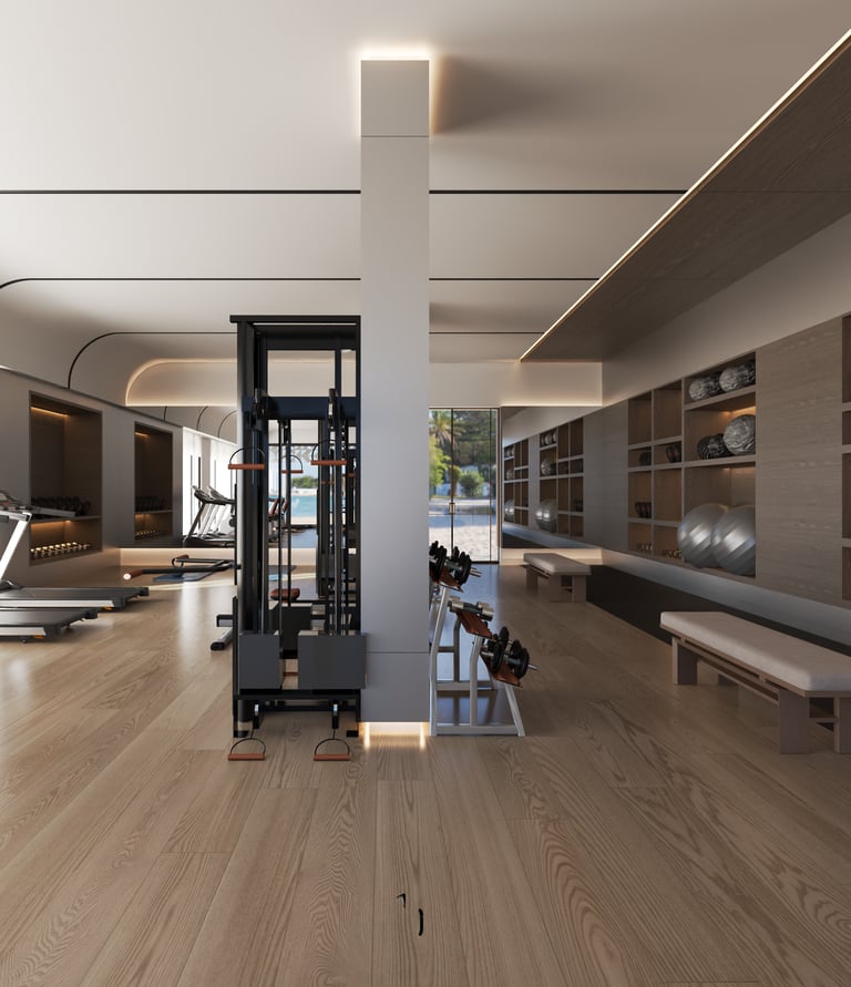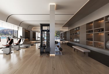 This gym in Dammam is designed with a simple and functional approach, featuring large windows and a sloping ceiling. The large windows allow natural light to flood the space, creating a bright and open atmosphere, while the sloping ceiling enhances the sense of spaciousness and gives the place a modern touch. The ceiling is made from wooden or metal materials, blending aesthetically with the rest of the design. LED lighting is strategically placed to evenly distribute light throughout the space, ensuring a comfortable environment for users. The design uses neutral colors with vibrant accents in the furniture to add energy and liveliness to the space.
