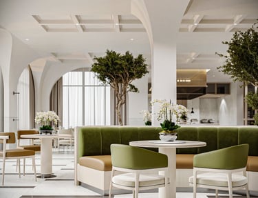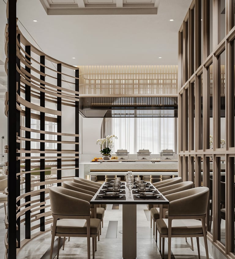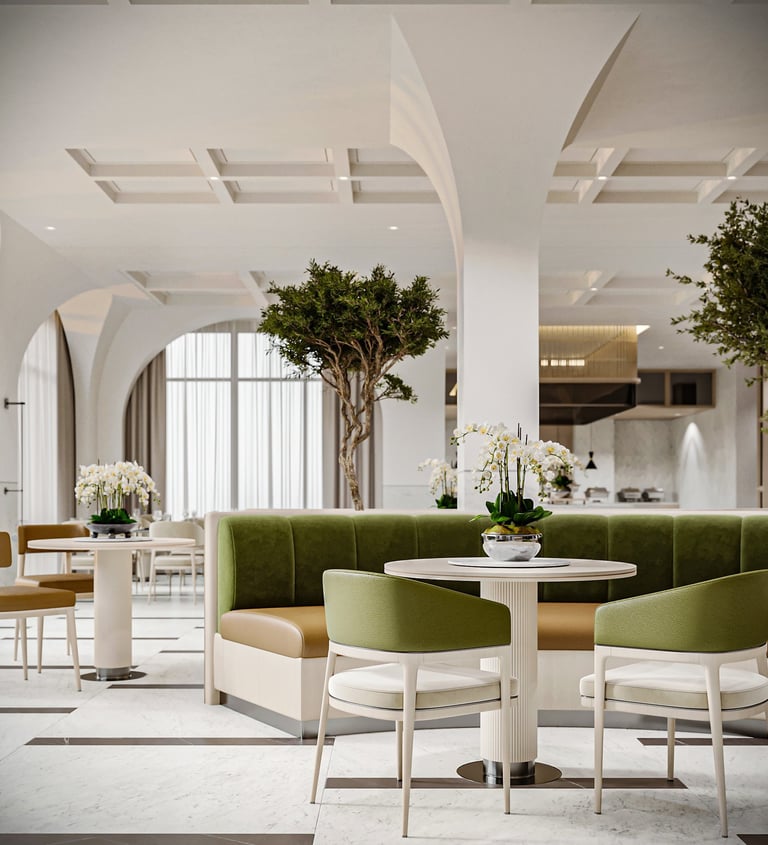 The main restaurant in the hotel is designed with a modern and minimalist approach, featuring light and bright colors to create a relaxed and comfortable atmosphere. Shades of white, beige, and light gray are used on the walls and furniture to establish a calm and warm environment. The seating is harmoniously arranged, with attention to comfort and privacy. Stylish yet comfortable chairs and sofas are selected to allow guests to enjoy their dining experience in ease. The ceiling is kept simple, using light materials like gypsum or wood to create a clean and elegant design that complements the overall aesthetic. Soft, warm lighting from LED fixtures enhances the ambiance, providing a cozy atmosphere for meals, with well-distributed light to make the space feel more expansive
