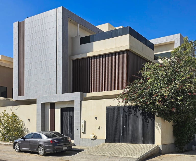 This luxurious villa is located in Al-Malqa neighborhood, Riyadh, It features a modern design that emphasizes comfort and privacy. The facade is adorned with elegant white panels and dark accents, creating a contemporary and distinctive look, with carefully planned window and entrance placements to ensure maximum seclusion. The surrounding green spaces are thoughtfully landscaped to provide a serene atmosphere and natural privacy, enhancing the villa's beauty. The villa also includes cozy outdoor seating areas, allowing the family to enjoy quality time in a sophisticated setting while maintaining complete privacy. Both the interior and exterior designs reflect a perfect balance between modernity and functionality, making it a unique and comprehensive living experience.